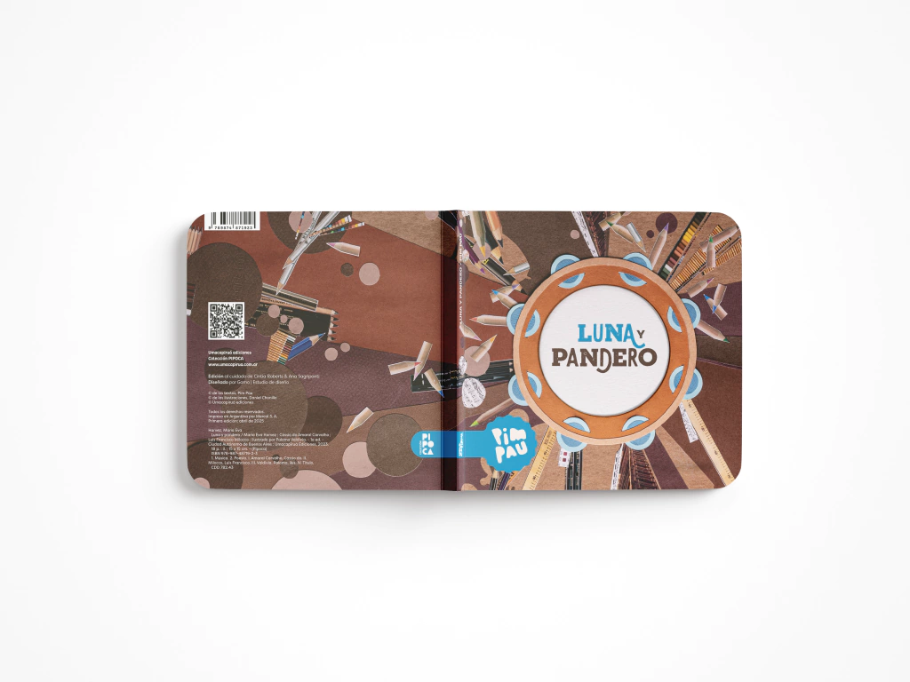 Una cuento musical, sonoro y corporal ilustrado con técnica mixta de collages y dibujo con lápiz de carbonilla. Los collages de Luna y pandero están hechos con cientos de lapicitos ínfimos recortados de revistas, pegados uno a uno junto a otros cientos de papeles de colores. Si mirás muy atentamente vas a descubrir que aquello que parecía una cabellera, un bigote, un vestido, es en realidad un sinfín de fotos diminutas, palabritas, números…